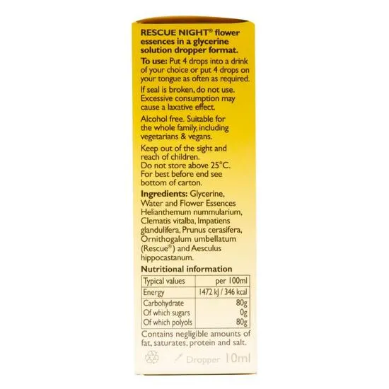 Glycerine, Water, flower essences (Helianthemum nummularium, Clematis vitalba, Impatiens glandulifera, Prunus cerasifera, Ornithogalum umbellatum, Aesculus hippocastanum (RESCUE® Night)).