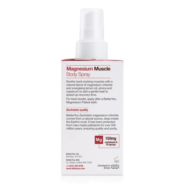 BetterYou Magnesium Muscle Spray – Magnesium is vital for optimal muscle contraction, skeletal strength, energy production and assists in sustaining the high oxygen consumption necessary for athletic performance. BetterYou Magnesium Muscle Body Spray helps replenish magnesium, supports optimal performance during training and aids muscle recovery post-training.