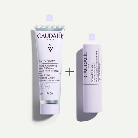 Caudalie Vinotherapist Lip & Hand Duo – Vinotherapist™ Hand and Nail Repairing Cream nourishes and repairs dry, damaged hands without greasiness, while protecting them from dehydration and external aggressors. Enriched with nourishing grape seed oil and anti-oxidant grape polyphenols, Lip Care provides long-lasting protection to soothe dry lips.