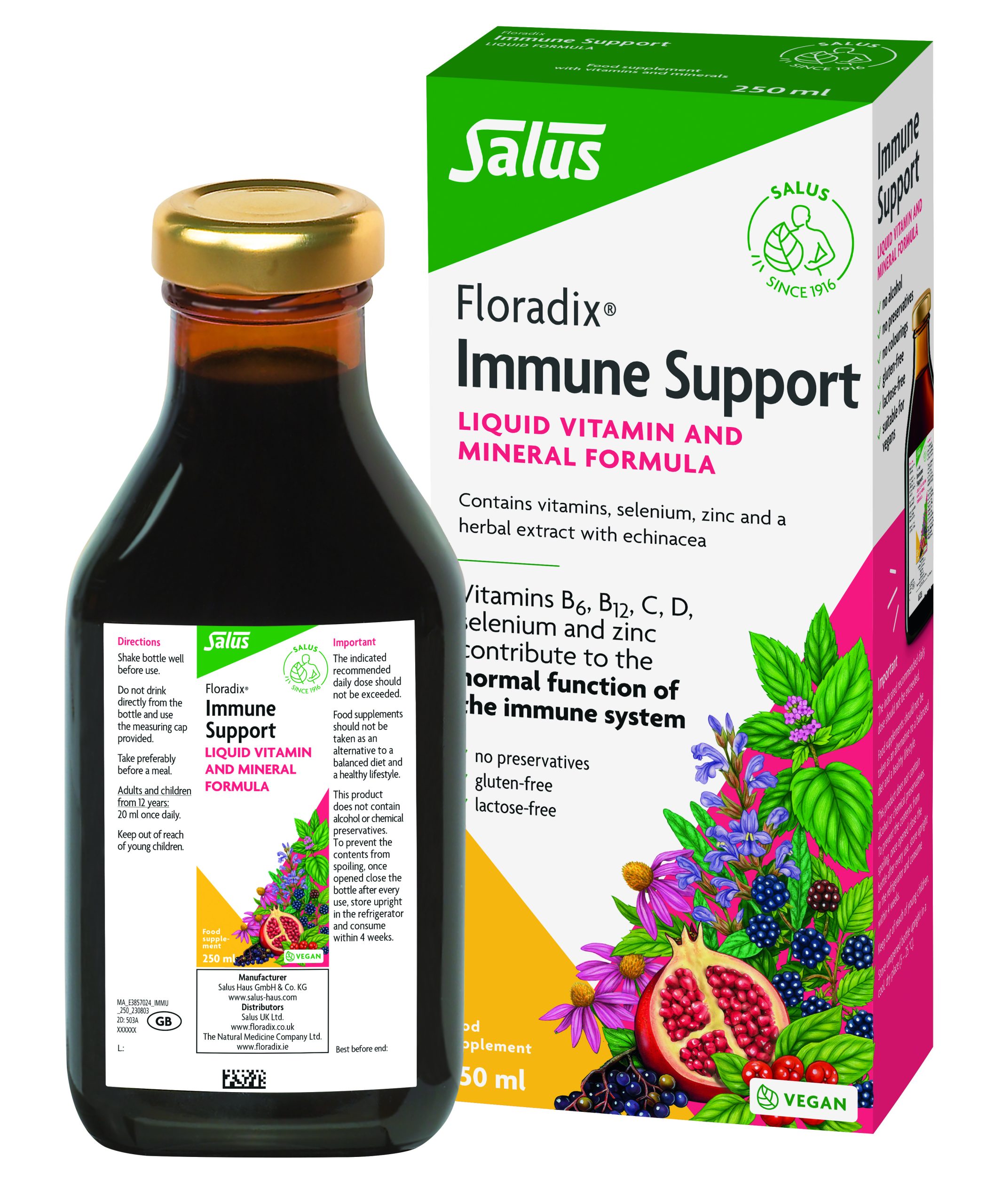 Floradix Immune Support contains vitamins and minerals to support your immune system: *Vitamin D3: contributes to the normal function of the immune system as well as to the maintenance of bones and normal muscle function. *Vitamin C: contributes to the normal function of the immune system as well as to the reduction of tiredness and fatigue and to the protection of cells from oxidative stress. *Vitamin B12: contributes to the normal function of the immune system as well as to the normal functioning of the nervous system and to the reduction of tiredness and fatigue. *Vitamin B6: contributes to the normal function of the immune system as well as to the normal functioning of the nervous system and to normal red blood cell formation. *Selenium: contributes to the normal function of the immune system and to the maintenance of hair and nails. *Zinc contributes to the normal function of the immune system and to normal cognitive.