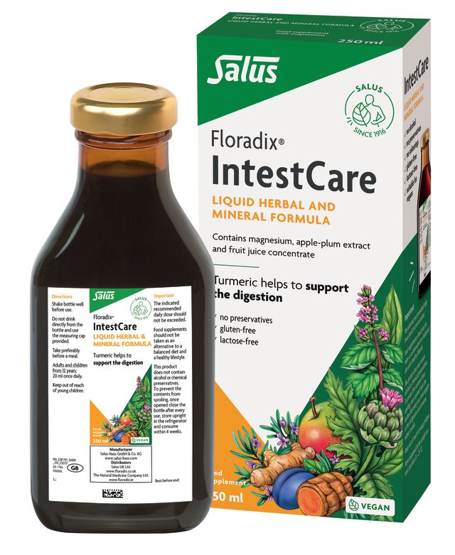 Floradix IntestCare is a fruity tasting herbal supplement. It contains herbal plant extracts from turmeric, peppermint leaves, artichoke leaves, rosemary leaves and ginger. The contained turmeric extract helps to support digestion whereas the contained magnesium contributes to the normal muscle function and to the normal electrolyte balance.
