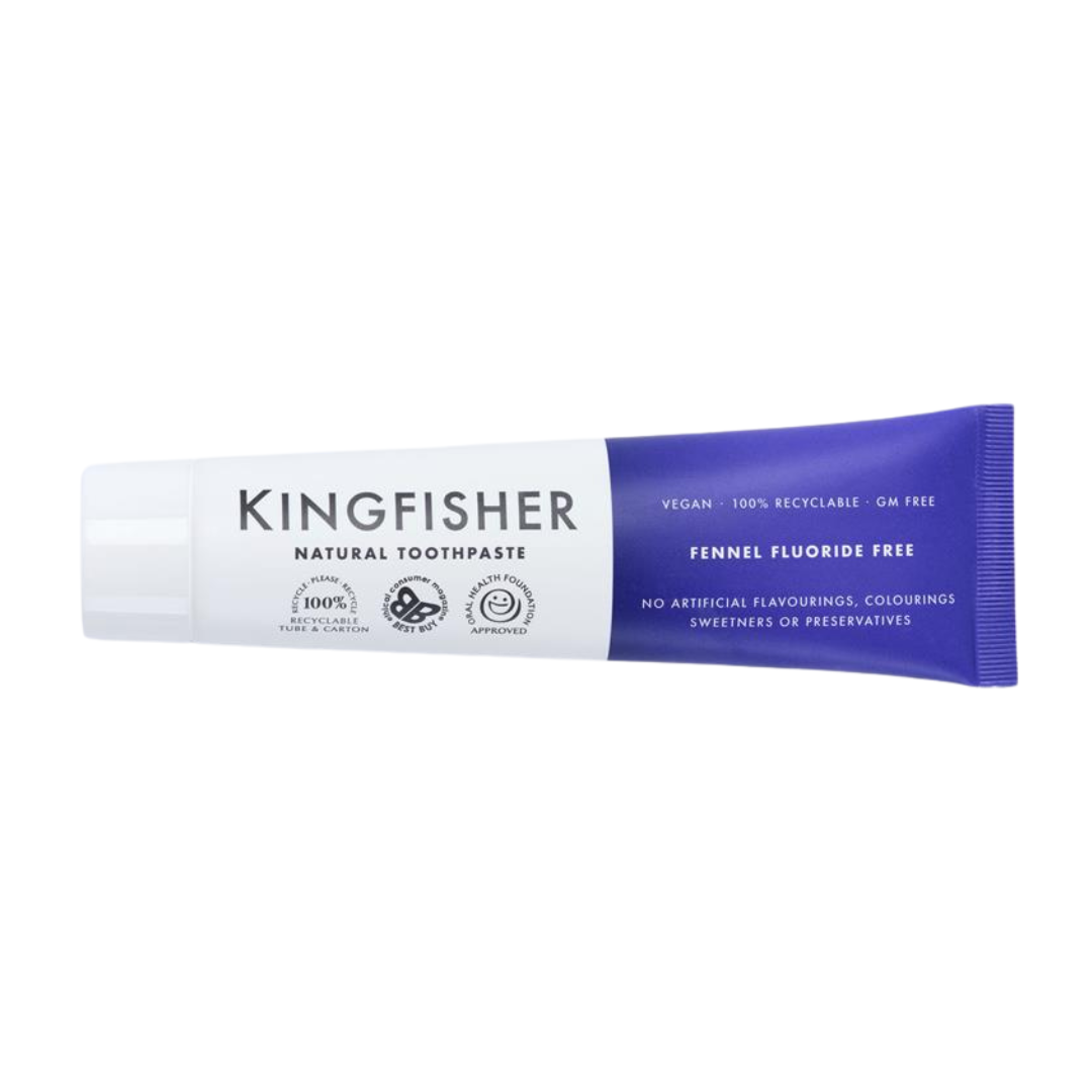 Kingfisher Fennel Fluoride Free Toothpaste – A delicious fluoride-free toothpaste containing no artificial sweeteners, flavourings, colourings or preservatives that is gluten free and GM Free. Suitable for vegetarians, vegans and, because it contains no mint, for those taking homeopathic treatments.